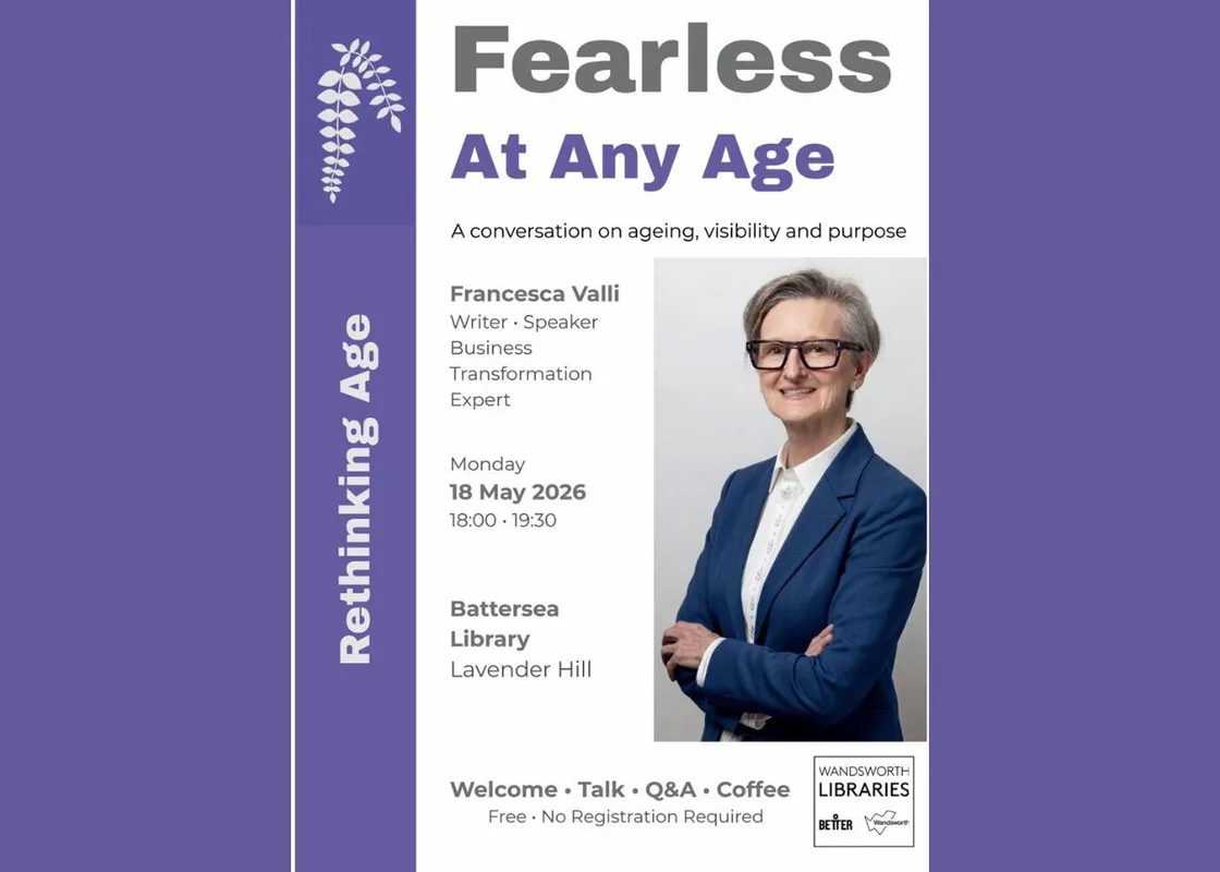 Join writer, speaker and business transformation expert, Francesca Valli, for an evening where we rethink age. The event is at Battersea Library with free entry and no registration required.