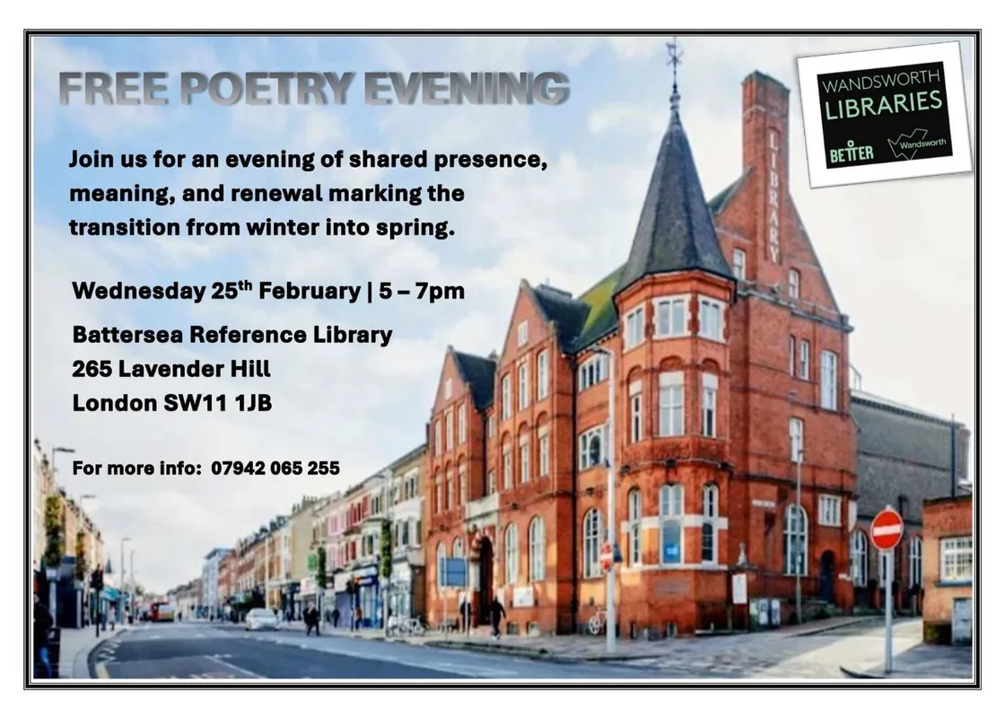 An evening of shared presence, meaning, and renewal at Battersea Library, marking the transition from winter into spring. For more info, call 07942 065 255.