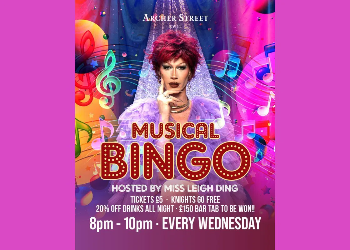Every Wednesday, Miss Leigh Ding will host a Musical Bingo evening at Archer Street SW11. Tickets £5, Knights go free. Enjoy 20% off drinks, all night, and the chance to win a bar tab worth £150!