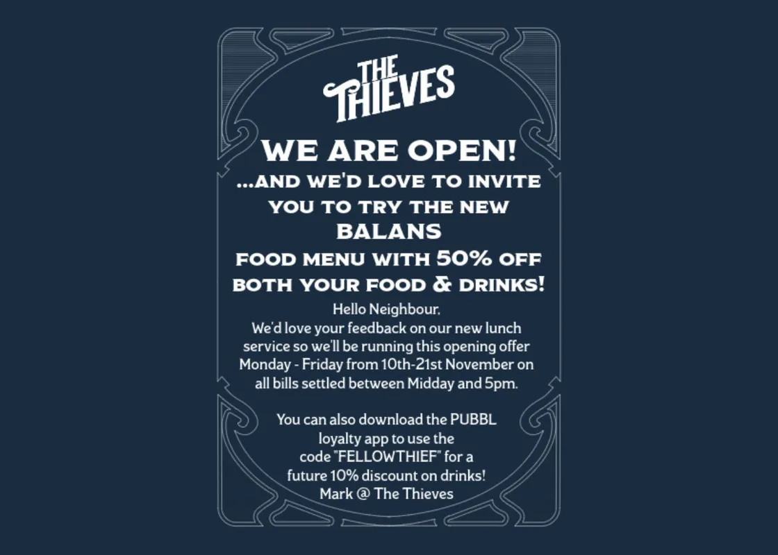 *T&Cs: 50% off all food and drinks applies only to bills settled between midday and 5pm, Monday-Friday, from 10th-21st November.