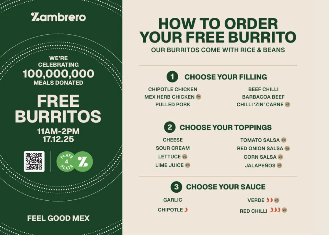 On 17th December 2025, Zambrero Battersea will be serving up FREE burritos/bowls from 11am-2pm. This is to celebrate reaching 100 million meals donated through their Plate 4 Plate Initiative. Every time a burrito or bowl is purchased, they donate a meal to someone in need through their Plate 4 Plate Initiative.